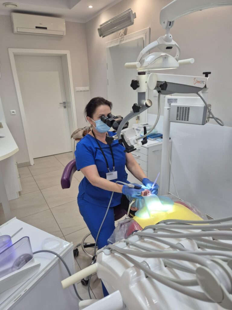 Ząb po leczeniu kanałowym ciemnieje – wybielamy go od środka. W komorze zęba umieszczamy żel wybielający, wymieniamy co kilka dni. Efekt po 2-3 wizytach.