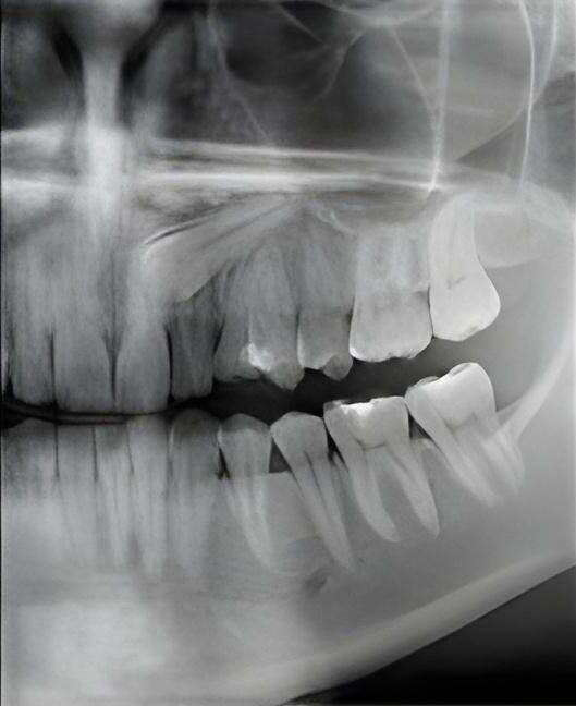 Obraz wszystkich zębów, kości szczęki i żuchwy na jednym zdjęciu. Pozwala ocenić stan całego uzębienia, wykryć ukryte ogniska zapalne, ósemki zatrzymane czy zmiany w kościach. Niezbędne przed leczeniem ortodontycznym, chirurgią czy planowaniem implantów.